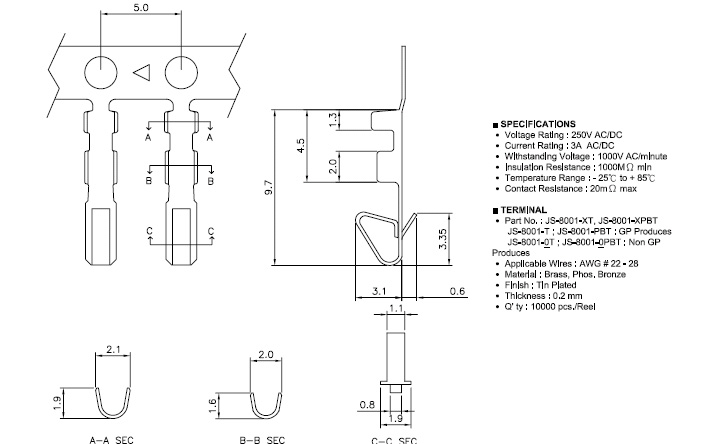 Applicable wires: AWG# 22~ 30 Material: Brass, phos bronze Finish:Tin plated ,