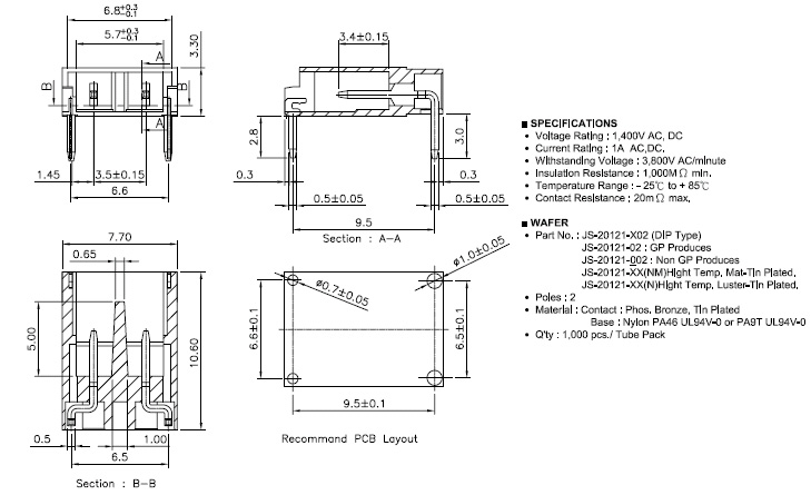 Poles: 2 Material: Contact: Phos. Bronze , Tin plated Base : Nylon PA46 UL94V-0 or PA9T UL94V-0 Q'ty: JS-2012 1,200 pcs/Tape & Reel JS-20121 1,000 pcs/Tube Pack |