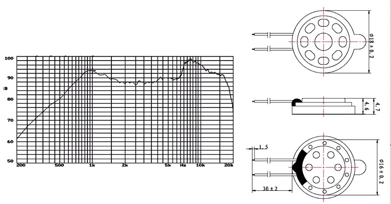 - Sound Pressure level: 90±3dB@0.1W10cm( at 1.0 , 1.2 , 1.5 , 2.0KHz in average)