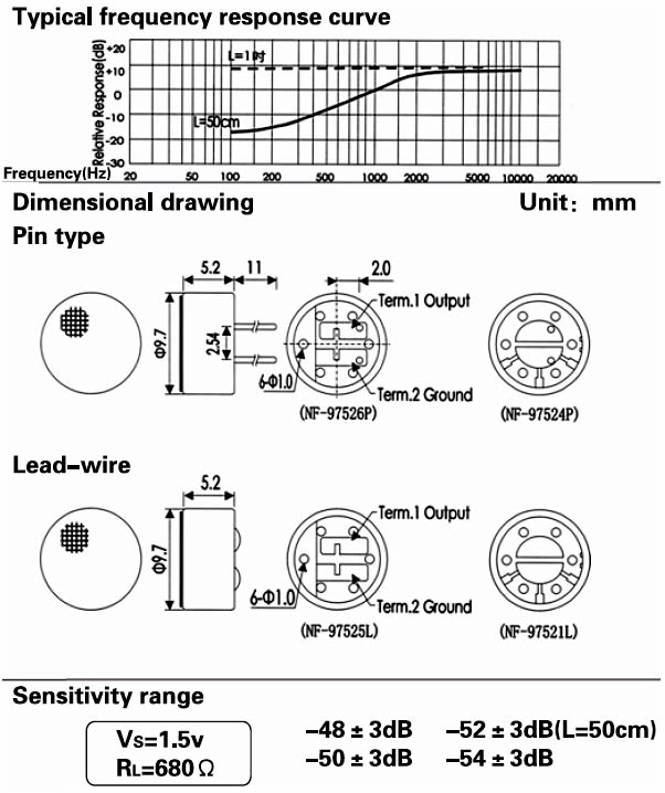 - Sensitivity: See above(0dB = 1v / Pa, 1kHz)