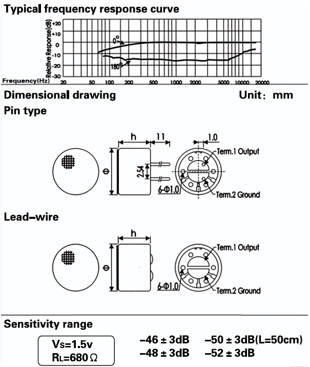 - Sensitivity: See above(0dB = 1v / Pa, 1kHz)