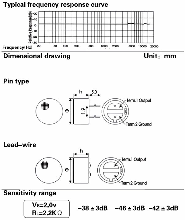 - Sensitivity: See above(0dB = 1v / Pa, 1kHz)