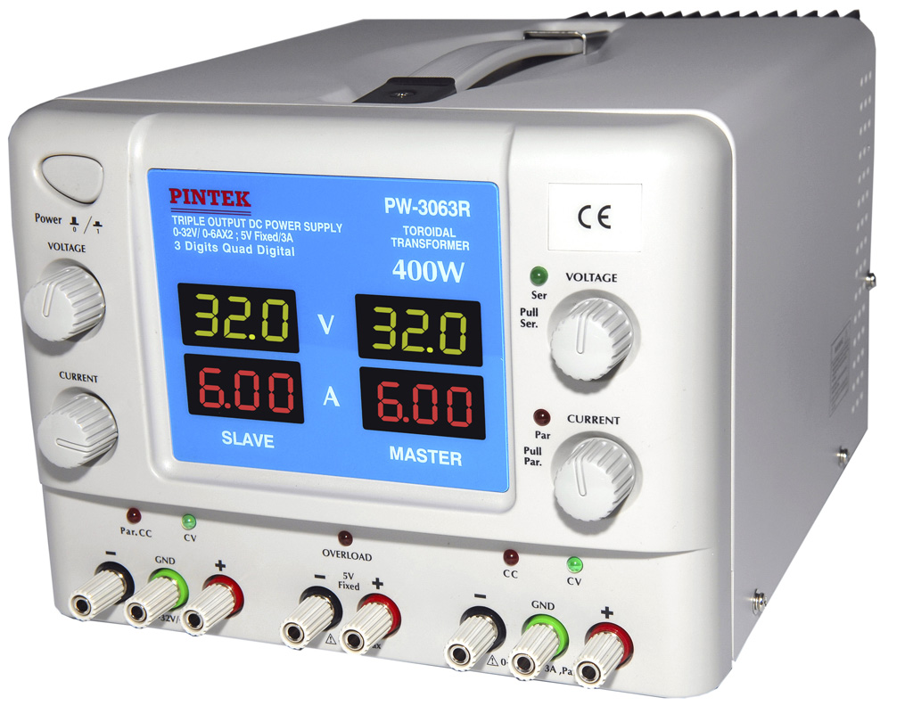 - Triple output, 0-32V/0-6A X2 and 5V/3A .Max. 400Watts