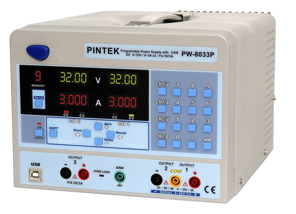- DC 0~32V / 0~3A X 2 + Fix 5V/3A
